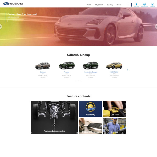 SUBARU様の海外特約店用WEBサイトを作成するCMSの開発・運営を15年以上にわたり行っています。毎年の車両コンテンツやブランドコンテンツの制作から、レスポンシブ対応やCTA機能の実装など、WEBの進化や役割の変化にあわせた競争力のあるサービス運営を続けています。それら機能を扱い易くするUI設計を行い、また特約店とのサポート業務も行っています。現在約30の特約店が利用。